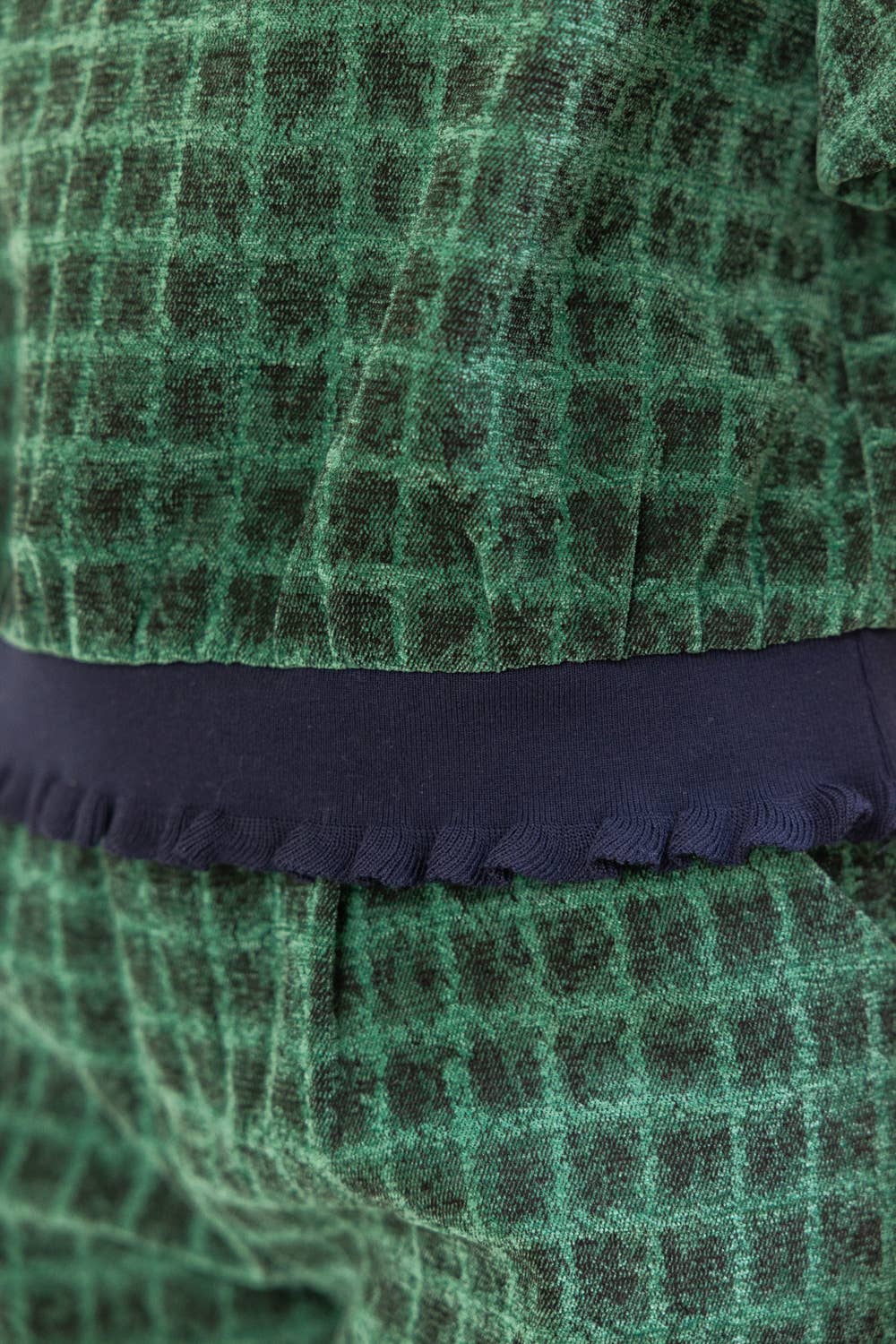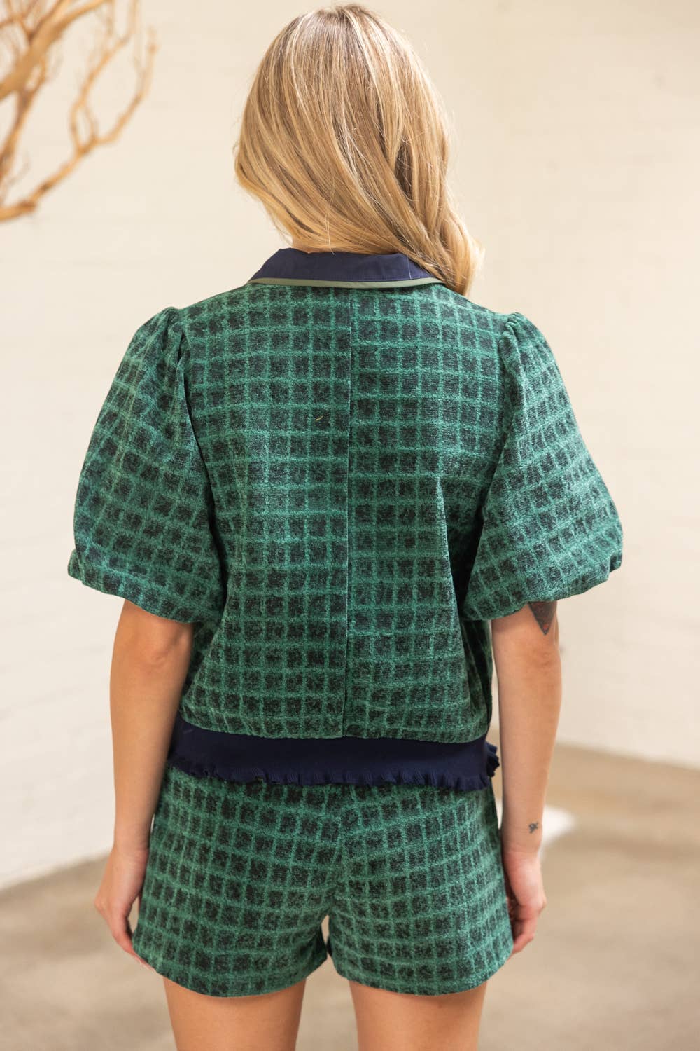 Modern and chic, this green square textured blouse features puff sleeves, a contrast navy collar, and a deep V neckline for a bold yet refined look — finished with a tailored hemline, it’s the perfect statement top for work-to-weekend style.